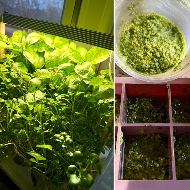 Pesto is super easy to make, takes about 5 minutes, freezes beautifully, and can be used in many dishes! It can be a topping for pasta, a marinade for meat or tofu, or a great flavor bomb in your favorite soup or stew. Yesterday, I made a batch combining all three of the above greens. It made enough for pasta for dinner, and I froze the rest into large ice cube molds for future suppers.