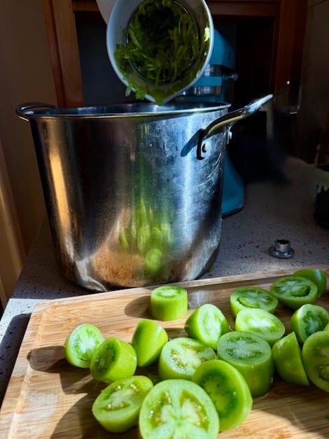 Sunday was a beautiful brisk fall day here in the upper Midwest. The light is breathtaking this time of year, and I just want to bask in it every chance that I get. We’ve had a couple of light frosts last week, so I knew that I had to tackle our tomato arbor and harvest all of the green tomatoes then clean out all of the vegetation, for our next planting. We now garden in a few raised beds in cattle troughs and whiskey barrels set up below the kitchen window of our 130 year old farm house. It’s a far cry from the days of our massive garden but now meets our needs as a family of empty nesters with kids in and out on their own time, except our weekly Sunday family dinner.