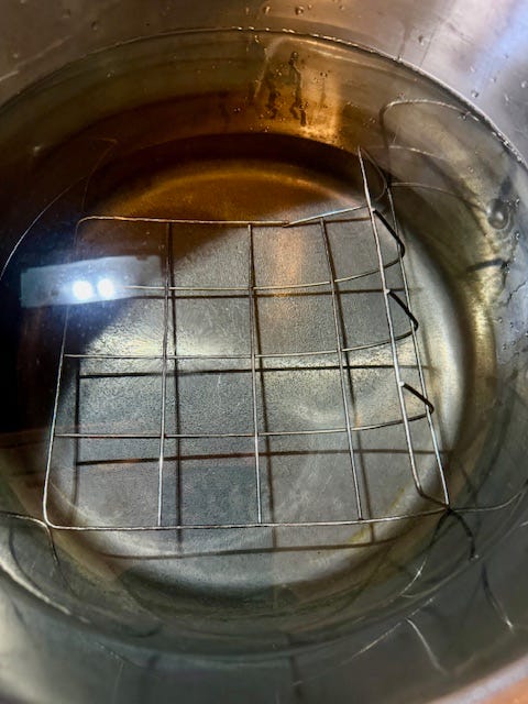 Guess what?! That dam*ed pressure canner was not steel, it was super thick aluminum and would not even think about heating on my induction cook top. So I washed out the stock pot that I’d made the relish in, poured the water in and then searched for some sort of grate to put in the bottom. Of course the grate from the pressure canner was way too big, I hauled myself back to the basement to try the rack from the water bath canner, it was even bigger than the grate. Finally I found, I don’t even know what it was, some sort of rack from something I don’t remember having, bent it and forced it in the pot. Unlike the three bears, it was not just right, but it would do!