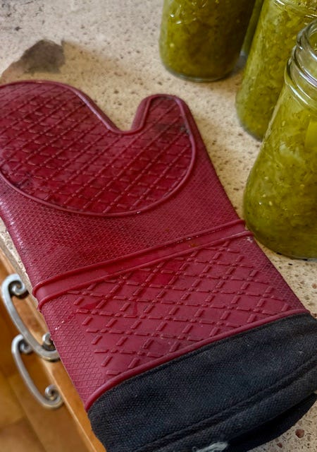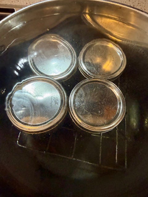 Now, I’m hot, tired and frustrated, and guess what?! I can’t find my canning tongs; the ones that I had less than a month ago when I did peaches! So throwing up my arms, I took a rubber potholder and processed the cans 4 at a time for 15 minutes each set.