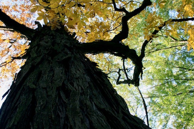 I connect deeply with seasonal transitions. When we bought our property, B and I were immediately drawn to a special place under this fantastic old tree at the edge of the drive. It is a vantage point from which we can look over the property. We called him Grandpa Hickory and he is well over 100 years old. His shag bark covers a mass of rings, not unlike what you see when tossing a stone into water. These rings are a record of the lives touched by this land and the ripple that we will leave in its history.