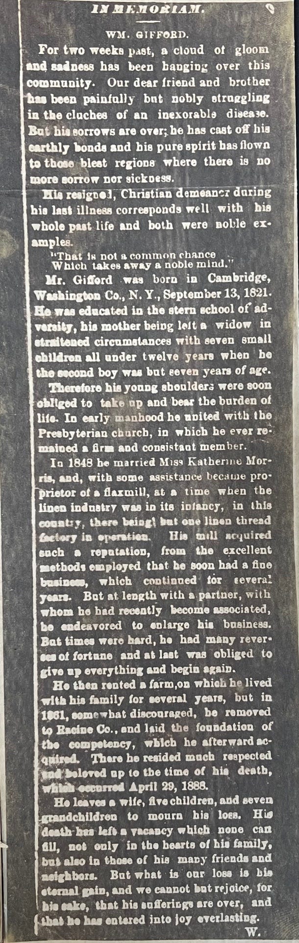 The original owners of the home were the William Gifford family who came to Racine County in 1843 and purchased 160 acres, it was homesteaded in 1844 and another 160 acres in 1888. William Gifford was said to be a gentlemen farmer and not very ambitious. His sons took over the farm in 1888. His son William H. Gifford was a progressive and innovative farmer. In 1890 he built the Queen Anne style house. The house was the first in the community with both indoor plumbing and central heating (the house doesn’t have a fireplace)! He also was the first to build a silo and have his cattle tested for TB.