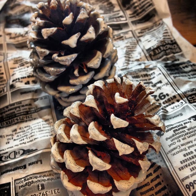Crafting for yourself or with your family. Several years ago I took advantage of the masses of pine cones we have in our yard and painted the tips in white and put a little bit of sliver glitter on them. I love to have a winter white theme in the house in January, so I stacked them in a large glass vase, and it stays out until February. They also make a cute hostess gift!